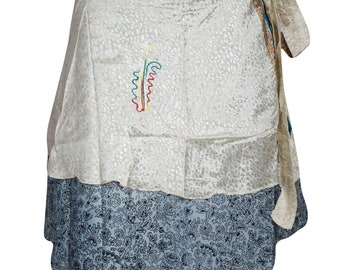 Vintage Recycled Sari Wrap Skirt Gray Blue Printed 2 Layer Bohemian Magic Wrap Skirt Hippie Chic Dress One Size