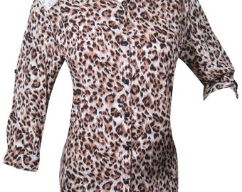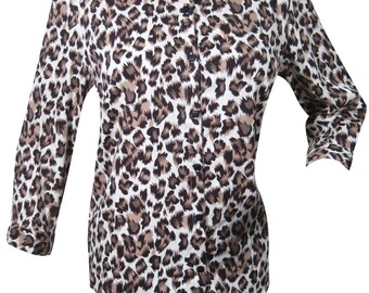 Women's Boho Blouse, Leopard Print White Shirt, Button Front Blouse HANDMADE Summer Shirt M