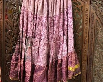 Bohemian Maxi Skirt, Womens Recycled Sari Full Flared Skirt, Pink Mauve FLORAL print Beach Summer Skirts M/L