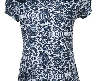Womens Floral Blouse, Blue White Button Front Blouse Bohemian Summer Cotton Tops M