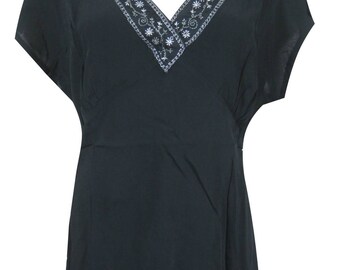 Womens Black Solid Top Bohemian Blouse Summer Boho Casual Caftan Blouse Tops M
