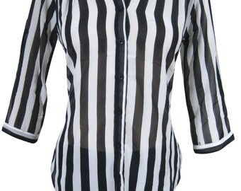Women's Boho Blouse, Soft BLack White Shirt, Stripe Style , Button Front Blouse Bohemian Summer Shirt M