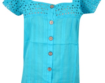 Womens Bohemian Blouse, Cotton Cutwork Gypsy Chic Blue Solid Top, Summer handmade Boho Shirt M