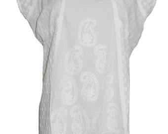 Womens Tunic Top, White embroidered Loose Blouse, Bohemian Cotton Summer Cover Up Beach Tops L