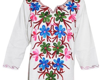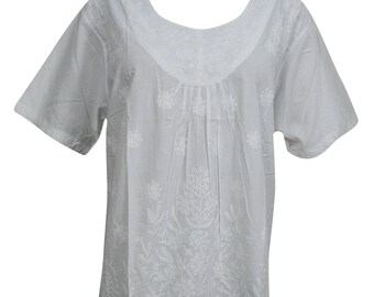 Women's Blouse Tunic, Loose White Embroidered Short Sleeves Summer Boho Kurti Shirt Top L