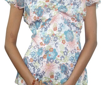 Women Boho Top,Soft Chiffon Blue White Floral Top Blouse, Casual Summer Blouse/Top SM