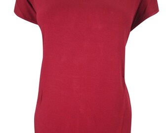 Women's Boho TOP Summer Beautiful Red Solid Jersey Blouse Short Sleeves Scoop Neck M