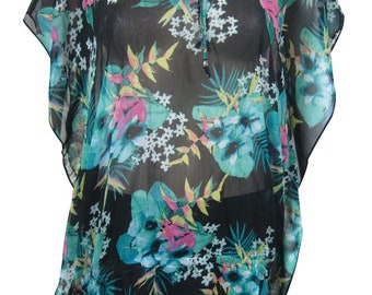 Womens Kaftan Top , Soft Chiffon Floral Cover Up Sheer Beach Caftan, Floral Summer Resort Kaftan S/M