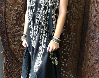 Womens Maxi Dress, Black Beige Flared Strap Dress, Batik Print Embroidered Gorgeous Boho Beach Long Dresses, Housedress ML