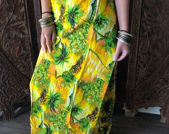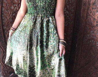 Womens Boho Tank Dress, Green Peacock Printed Maxi dresses, Soft Satin Ruched Top, Hi Low Beach Dresses One Size SM
