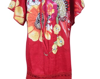 Womens Summer Gypsy Dresses, Boho Red Floral Printed Loose Vintage 70s BEACH Dress ML
