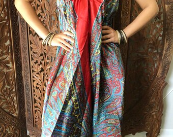 Womens Boho Strap Dress , Hi Low Maxi dresses, Red floral printed, Soft Satin Bohemian Beach Dress, One Size ML