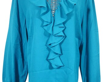 Womens Bohemian Blouse, crepe Gypsy Chic Blue Solid Top, Summer Comfy Tunic Top M