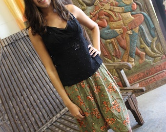 The colorful and mystical prints of the hi low sari skirts worn with skinny halters create a signature boho style. The stylish skirt