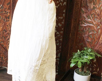 Womens Midi Skirt, Ivory Cut Out Design Handmade Boho Skirts, Tiered Summer Beach Long Skirts S/M